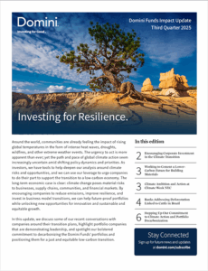 Our latest Impact Update discusses some of our recent conversations with companies around their transition plans, highlight portfolio companies that are demonstrating leadership, and spotlight our bolstered commitment to decarbonizing the Domini Funds’ portfolios and positioning them for a just and equitable low-carbon transition.